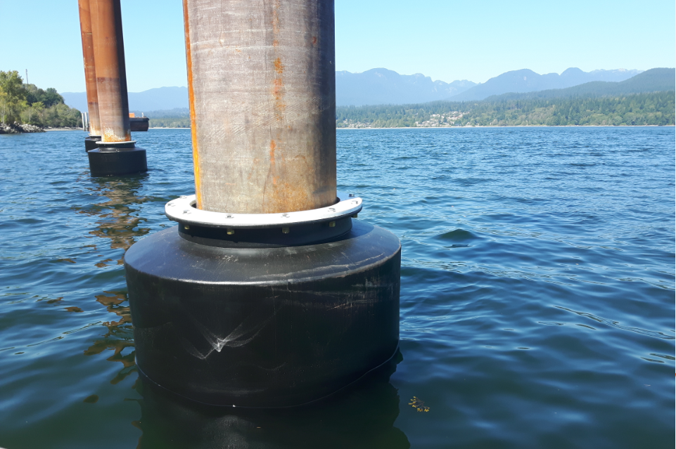 Sitting on top of the fenders are mooring crowns, which are robust steel structures that slip over the monopile and rest on top of the donut fenders. Each mooring crown is designed to rotate freely due to low-friction UHMW bearing pads and with multiple bollards for the vessel’s dock lines. Because the mooring crown rotates independently of the monopile and the donut fender, movement of the vessel in windy and high-current conditions puts less strain on the dock lines than if they were tied-down to a traditional fixed cleat on a dock or wharf.